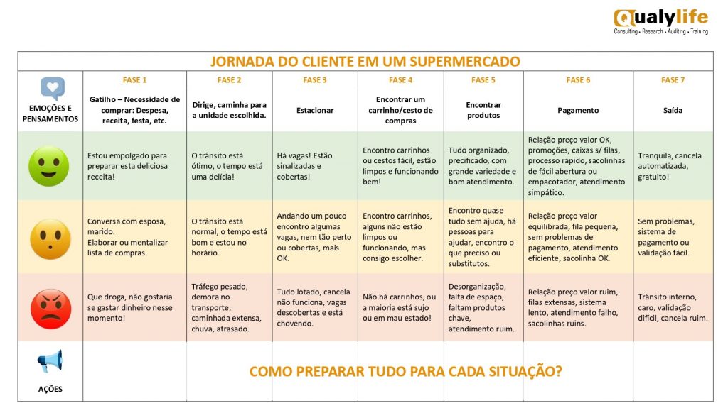 Para ter uma ideia da complexidade e importância desse estudo, veja abaixo um exemplo de análise genérica da jornada do cliente em supermercados, que criamos para introduzir o assunto com você.
